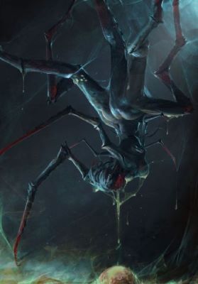 Но это была не просто органика. Из кровавого месива, из самого хребта того, что когда-то было мужчиной, выползла тварь. Её появление медленное, мучительное, рождение из самого ада. Сначала показались длинные, тонкие, хитиновые конечности, покрытые грубыми чёрными волосками и усеянные мелкими, шипастыми наростами. Они судорожно цеплялись за края раны, вытягивая наружу основное тело — выпуклое, блестящее, цвета старой крови. Оно было меньше человеческого туловища, но куда более плотное и откровенно паучье. Восемь бездонных глаз-пустот, расположенных по кругу, немедленно уставились в пространство, без разума, но с невероятной, всепоглощающей жаждой. Это был квинтэссенция кошмара, воплощение всего самого отвратительного, что только может породить тёмная щель между мирами.
