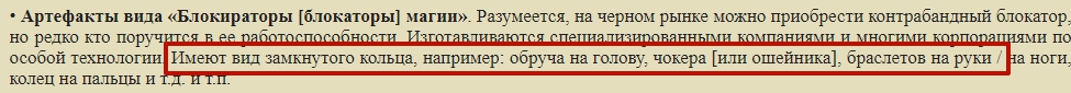 Цитата: "Гимли"Возможно ли вообще иметь блокираторы в качестве артефактов и как они должны ограничиваться? Я избегаю упоминания Ослабляющей магии, так как это показалось привязанным к волшебникам, а мне интересны именно артефакты в руках немага.