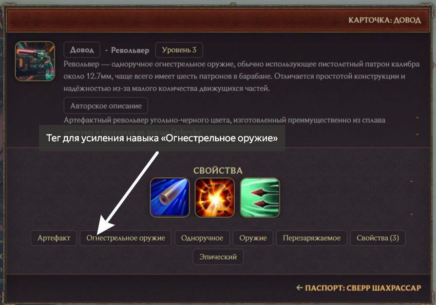 » Перед покупкой артефакта рекомендуем ориентироваться на тег, который показывает, к какому навыку подходит конкретный артефакт. В случае, если у вас есть артефакт, способный превращаться в артефакт другого вида [например, кинжал, трансформирующийся в пистолет], то после трансформации используются теги нового вида артефакта.