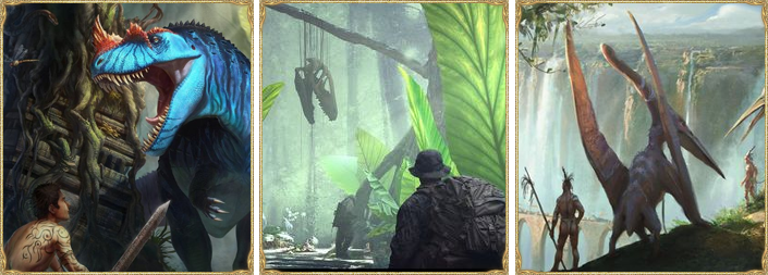 Можно отыгрывать за динозавров (только за тех, что у Калеба внизу)! Можно кидать кубик на свое усмотрение, но чтобы убить одного из следующих динозавров требуется выкинуть любой подходящий навык с результатом 25 и больше против него (хотя бы один бросок навыка 25+ убьет динозавра).