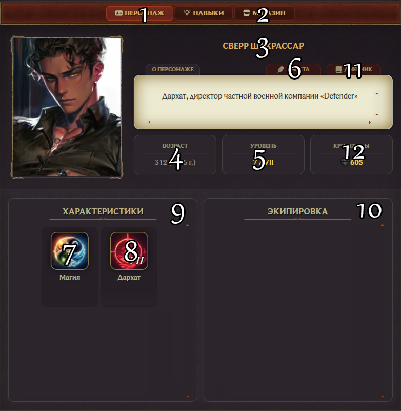 5. Уровень персонажа [первая цифра] и уровень источника [вторая цифра]. Устанавливает администрация в соответствии с анкетой. Раздел кликабелен, внутри находится информация о количестве магических или псионических зарядов вашего персонажа, а также сводка характеристик. Фиолетовые цифры обознают базовые характеристики, оранжевые от специализаций, зеленые от артефактов.