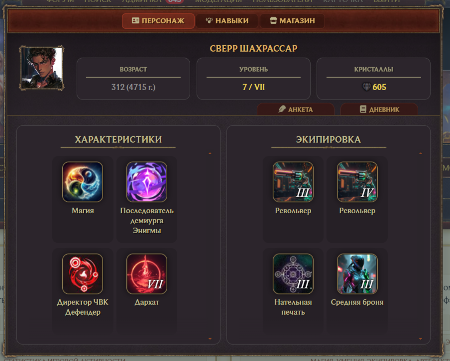 Личная карточка и магазин — это встроенные функции форума, которые позволяют вам полностью управлять развитием своего персонажа практически без участия администрации. Вы можете не заполнять карточку персонажа, однако будьте готовы к тому, что Мастера игры имеют право отказать такому персонажу в участии в квестах, а также броски кубиков придется осуществлять в ручном режиме.