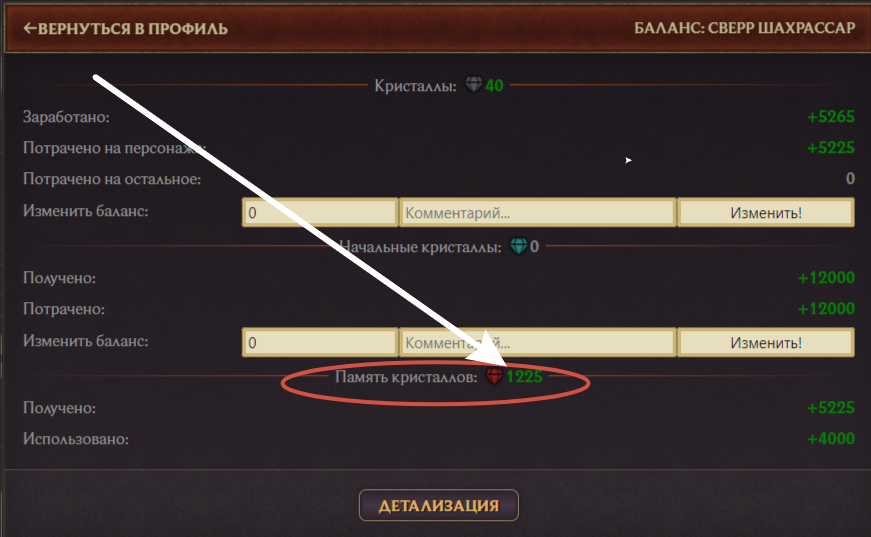 Чтобы узнать сумму потраченных на прокачку кристаллов, необходимо открыть карточку персонажа и выбрать третий раздел «КРИСТАЛЛЫ». Красные кристаллы и есть нужное вам число. В графе «Память кристаллов» должно быть требуемое количество кристаллов [подробнее на скрине].